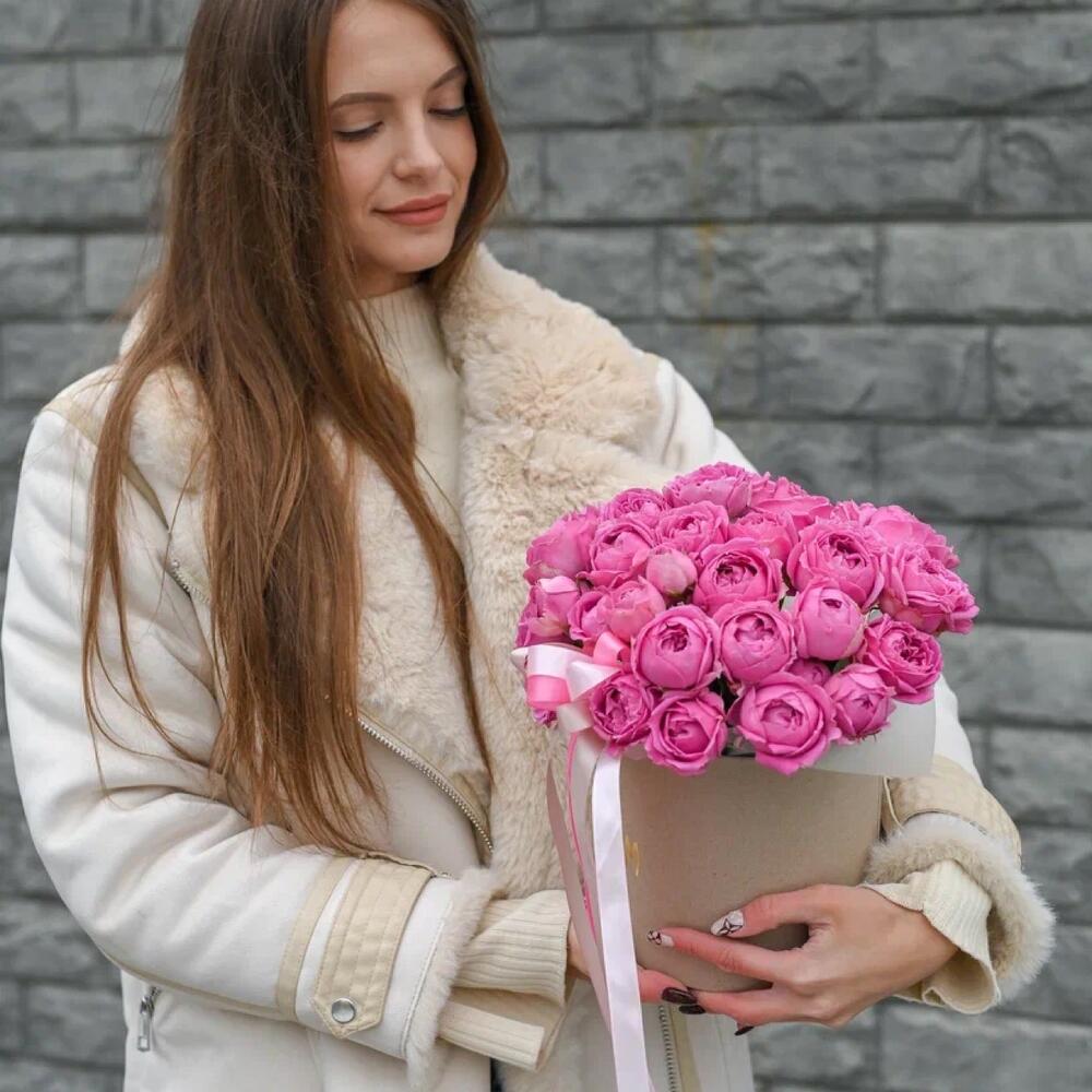 Пионовидные розы Мисти Баблс в шляпной коробке (Размер S, 15шт) в Коврове